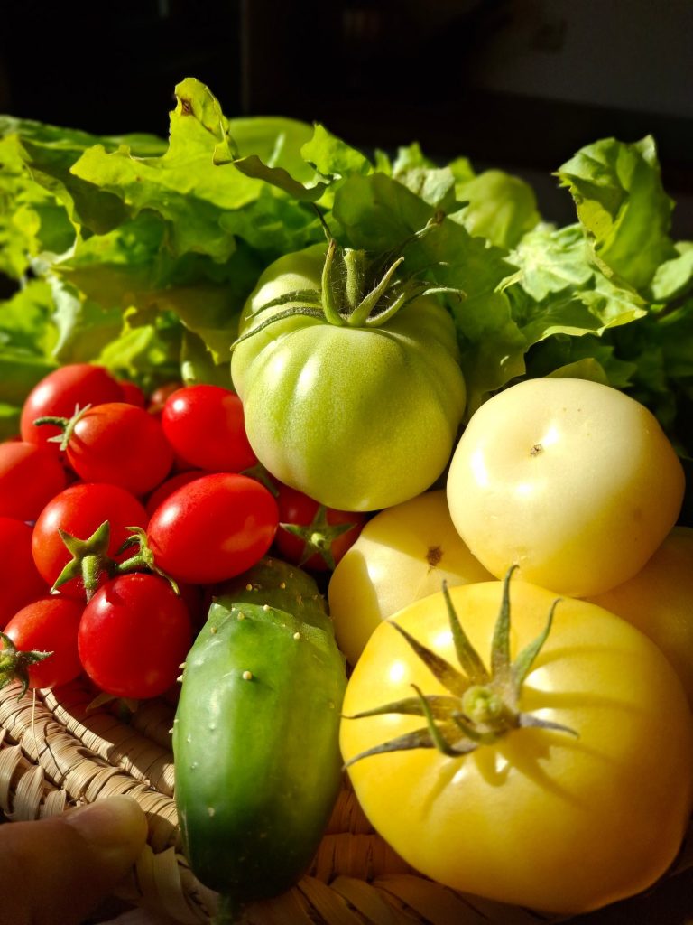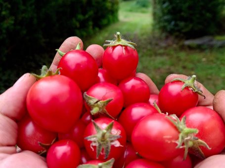 Zitronen-, Zimt- oder lilaner Basilikum verströmen intensive Düfte. Kohlrabi in Violett oder Grün überrascht mit zarter Süße. Möhren in Orange, Gelb, Lila oder fast Schwarz erzählen von vergessenen Sorten und kräftigen Böden. Und Tomaten? Von sonnengelb über gestreift bis tiefrot – jede bringt ihren ganz eigenen Charakter mit und wird eigens für euch angebaut.